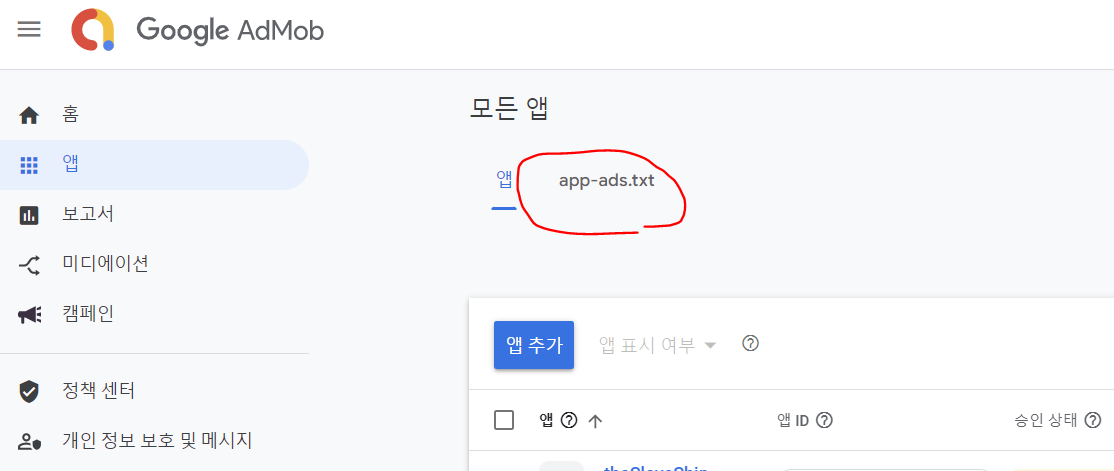 이미 등록이 되어서, 오류가 있는 화면을 캡처하지 못했지만, 오류가 난 상태에서 Admob -> 모든 앱-> app-ads.txt 탭을 클릭합니다.