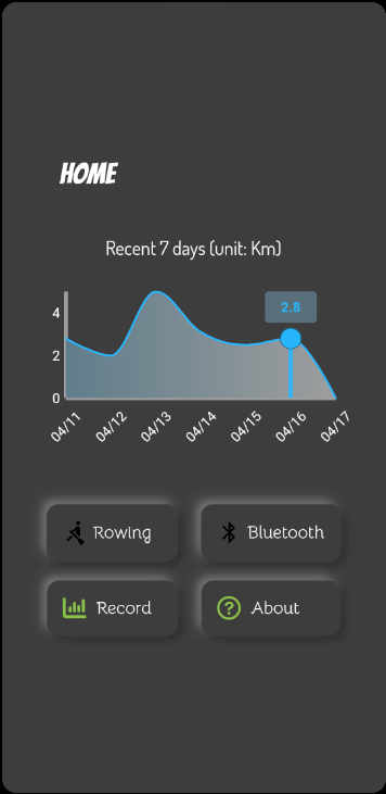 And there are 4 buttons, Rowing for row game, Bluetooth for machine setting, Record for whole data, and About for app information.